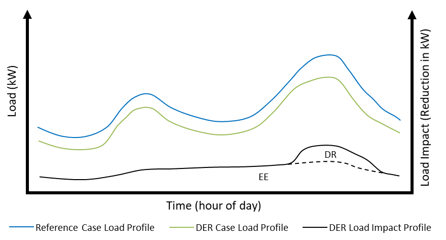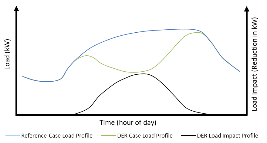 The net difference between the Reference Case load profile and the DER Case load profile is referred to herein as the DER load impact profile. For some types of DERs (e.g., distributed generation), the DER load impact profile can be developed irrespective of the Reference Case and DER Case profiles. (For an example, see Section 11.4.1 which shows a simulated solar PV load impact profile that also represents the DER load impact profile.) But ultimately, the interest is in how the DERs affect the Reference Case.