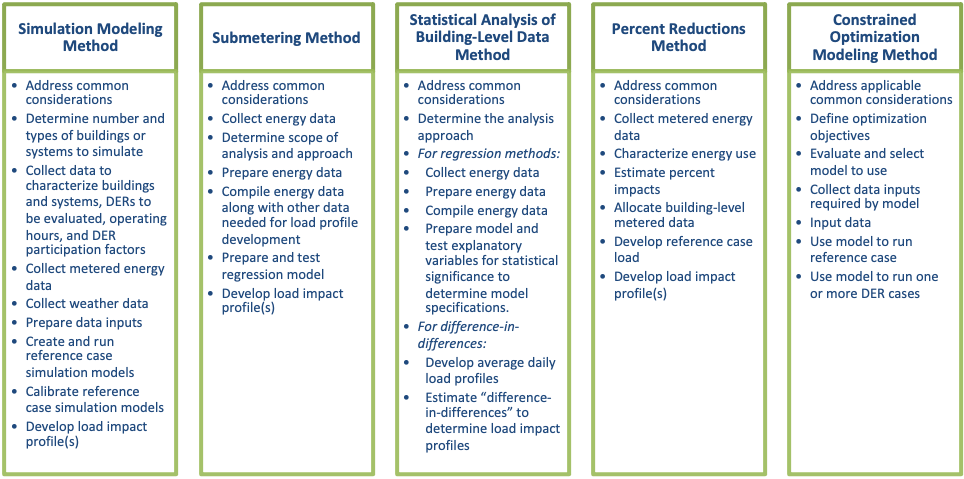 Developing DER load impact profiles involves the general process shown in Figure 46. To carry out the process, practitioners select from five main categories of methods: (1) simulation modeling, (2) submetering, (3) statistical approaches, (4) percent reductions, and (5) constrained optimization modeling. Within these main categories there are some subcategories with variations in approaches. In addition, several of these methods employ elements from one or more different methods. The methods described below can also be used together to form a “hybrid” approach for more complicated analysis, such as when evaluating multiple DERs in combination.