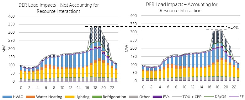 Figure 49. Illustrative example – multiple-DER analysis: comparison of DER load impact profiles with and without accounting for resource interactions